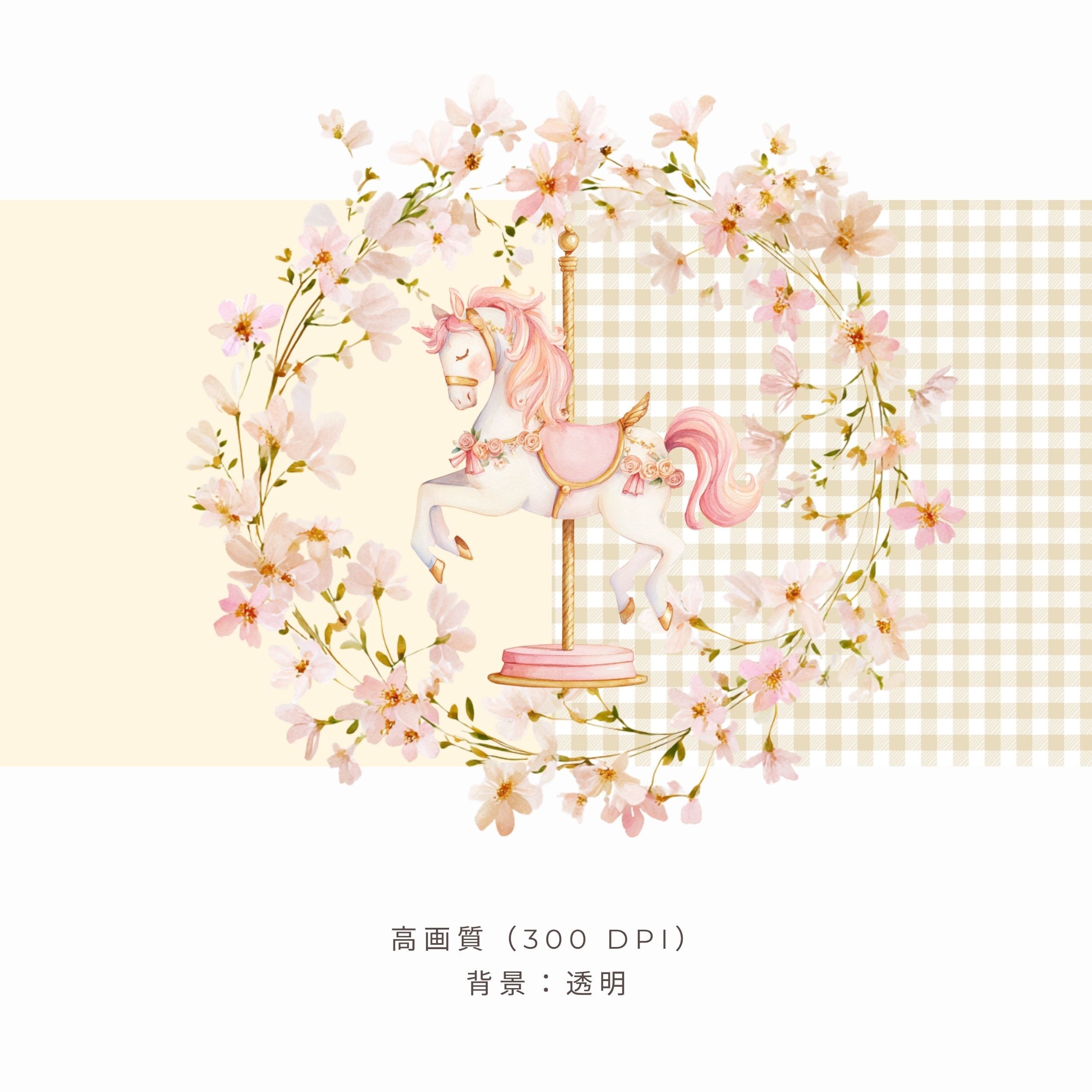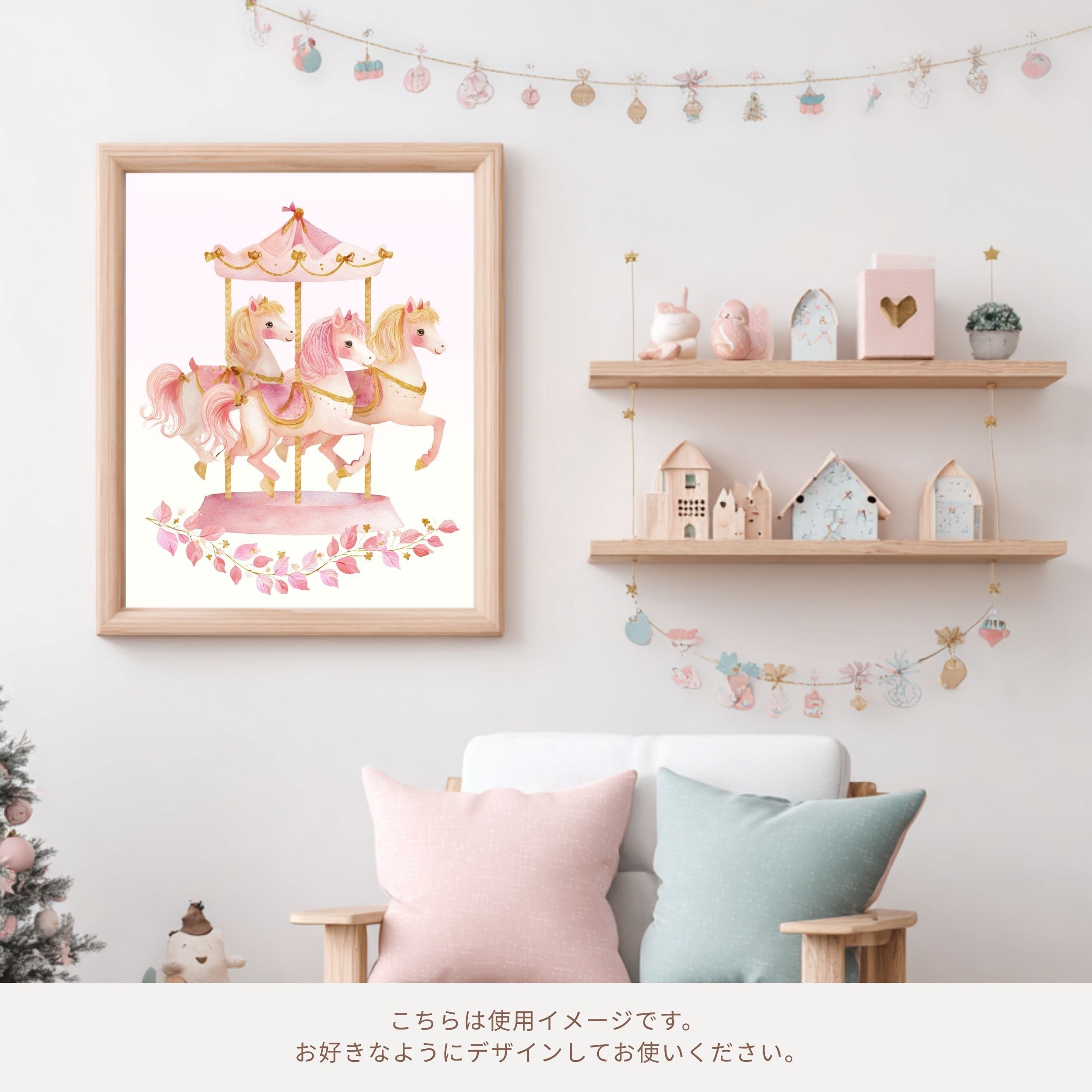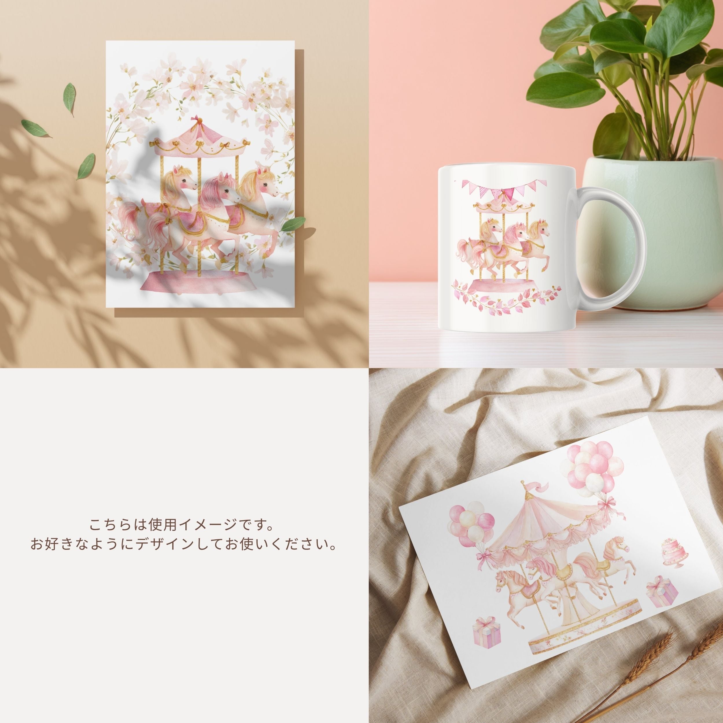 淡いピンクのメリーゴーランドを描いた水彩イラストです。