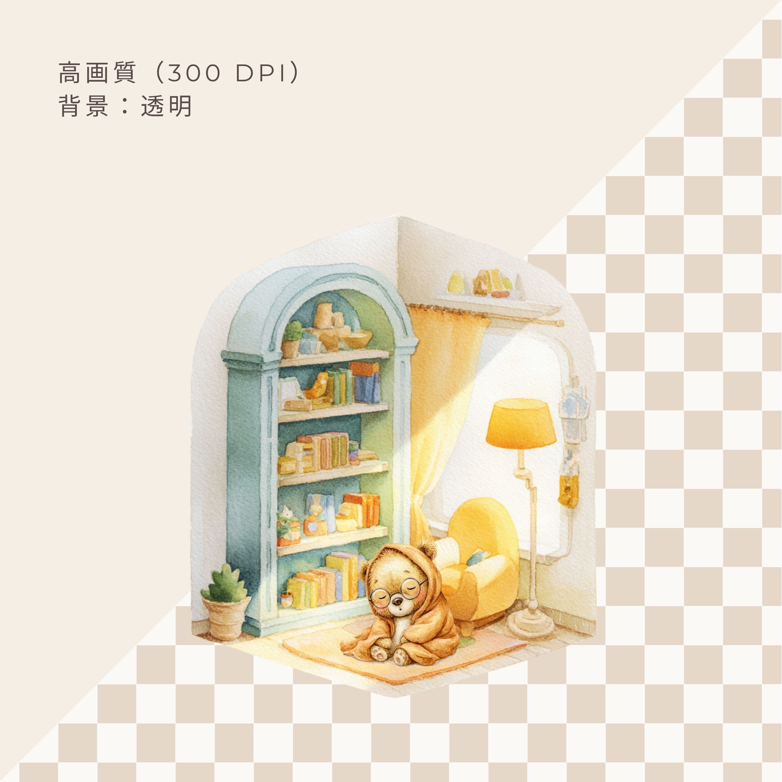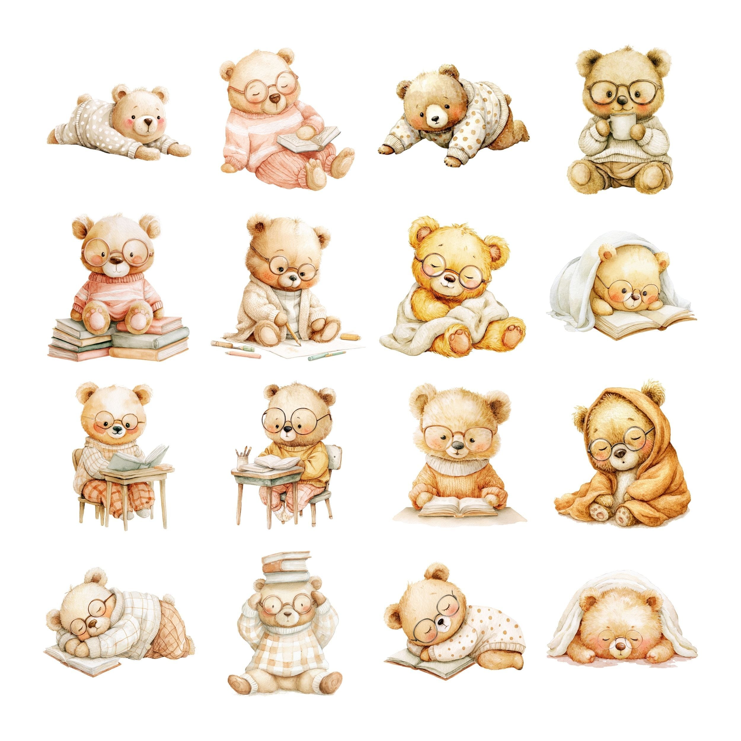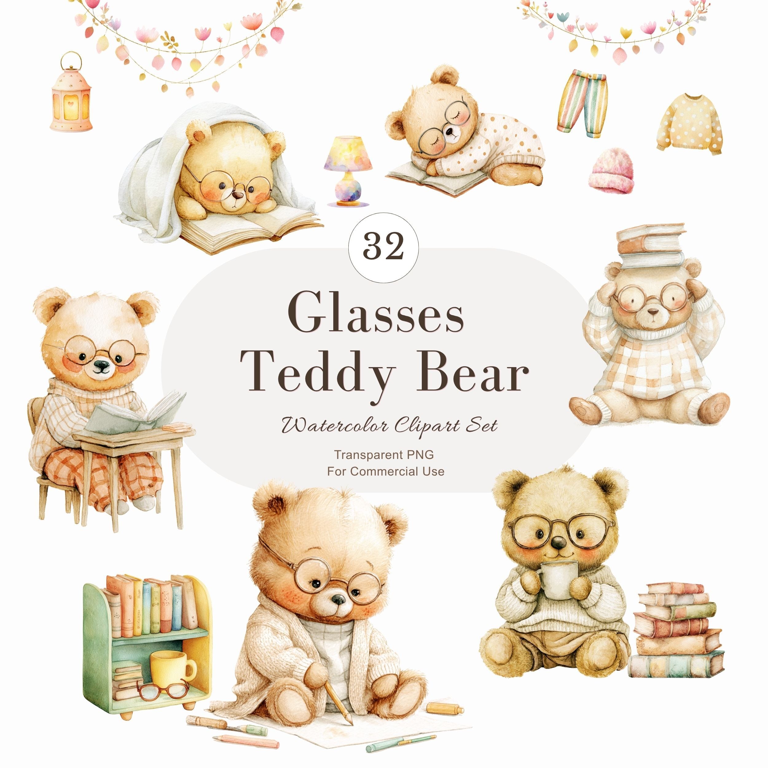 めがねをかけた可愛らしいテディベアの水彩イラストです。