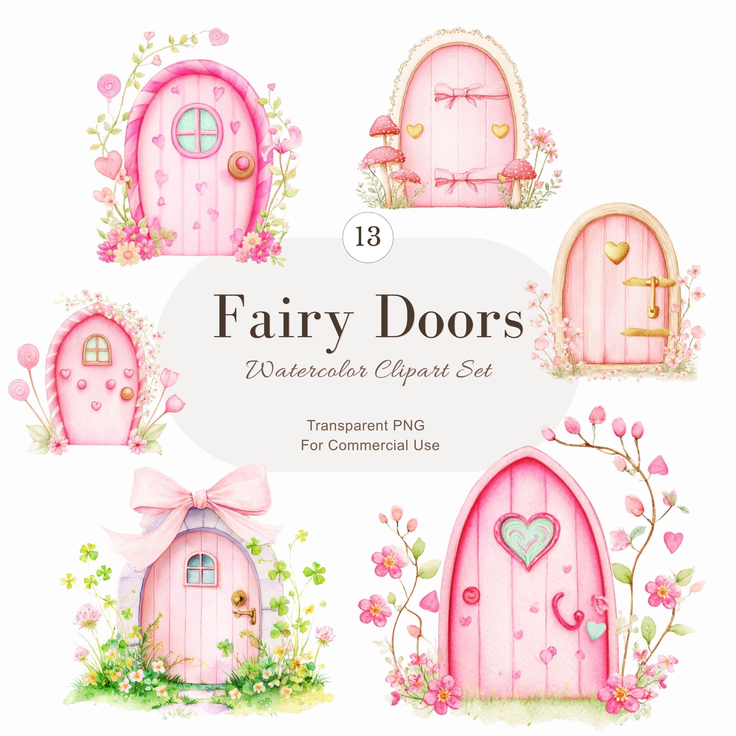 花に囲まれた妖精のドアをテーマにした水彩イラスト素材セットです。