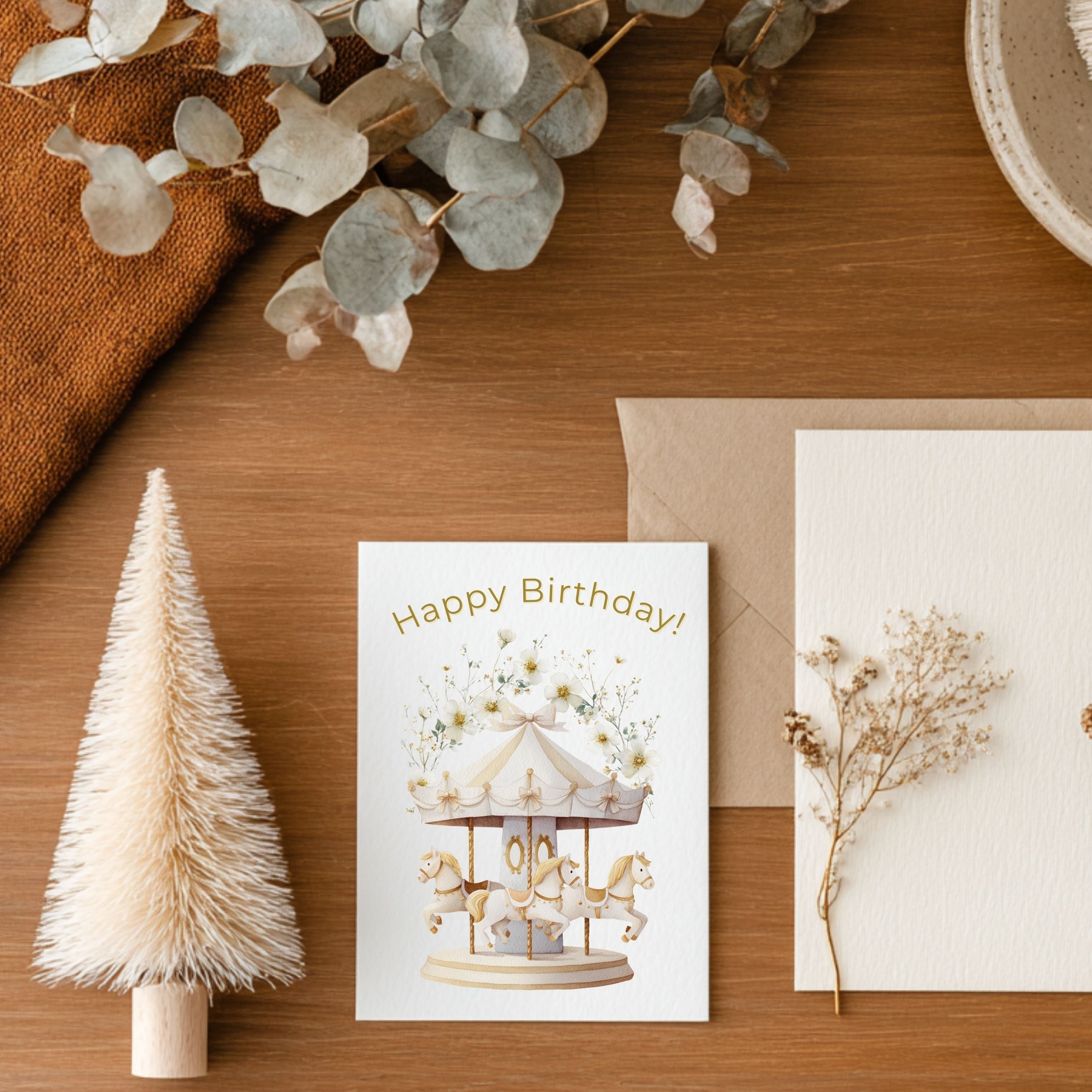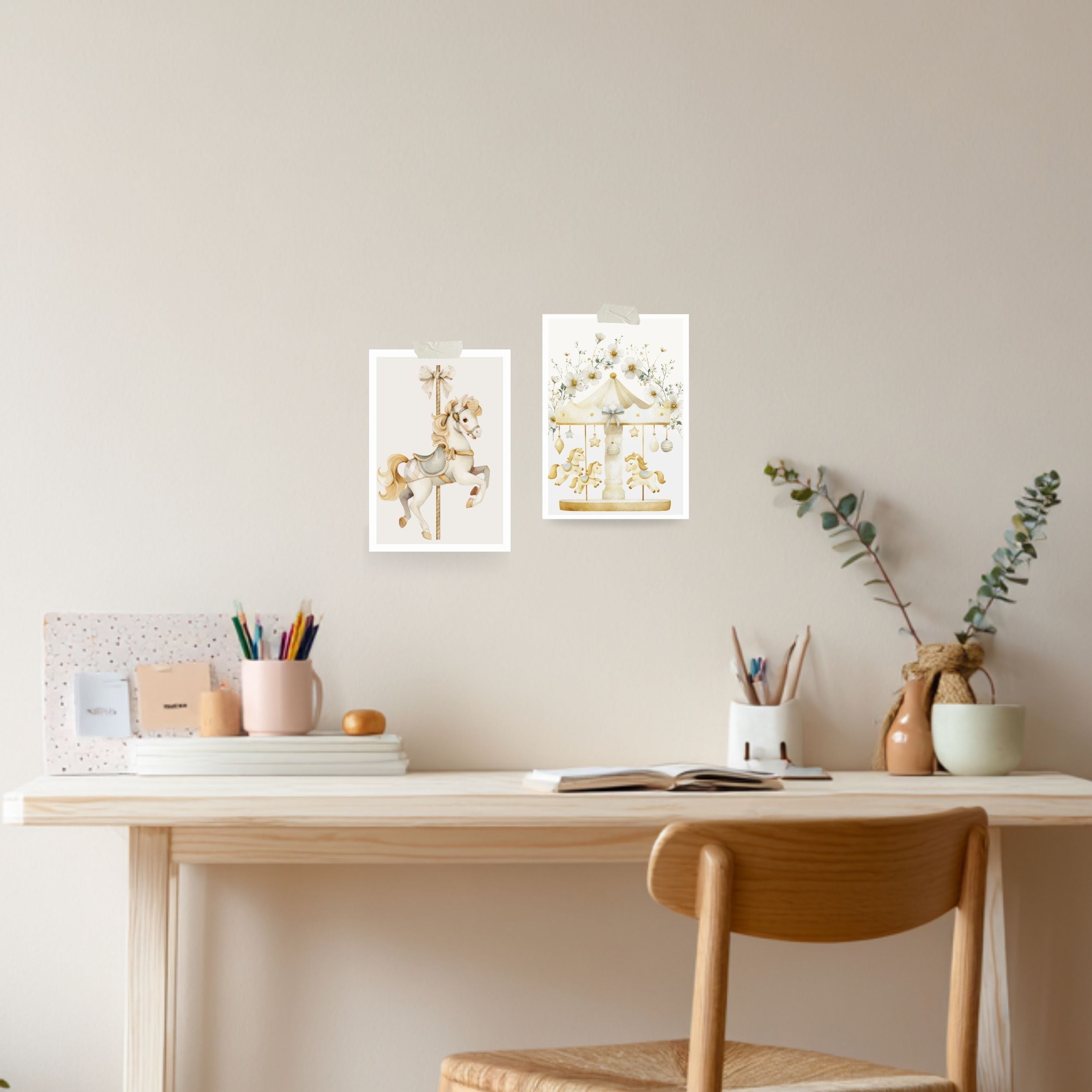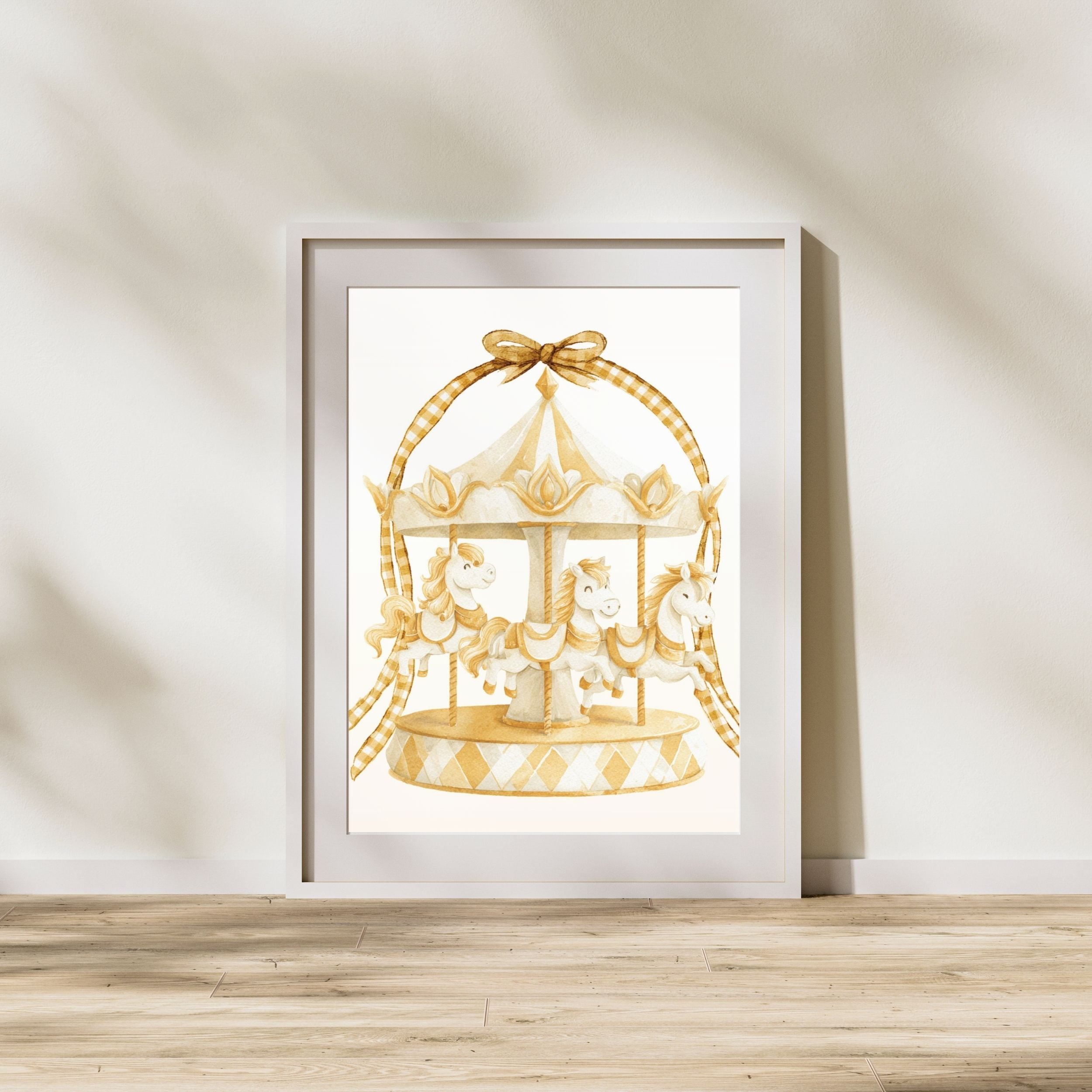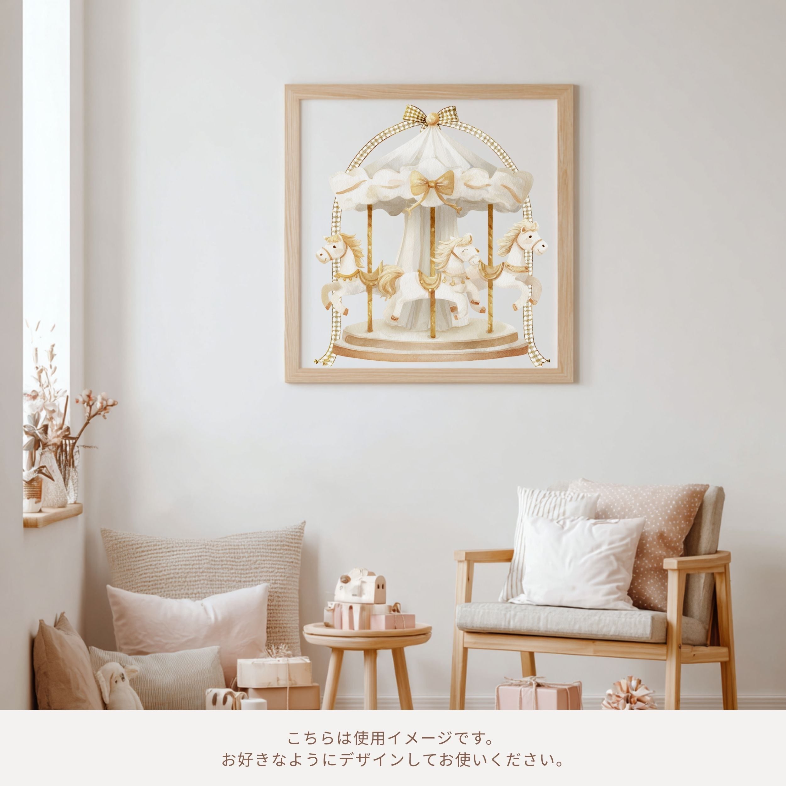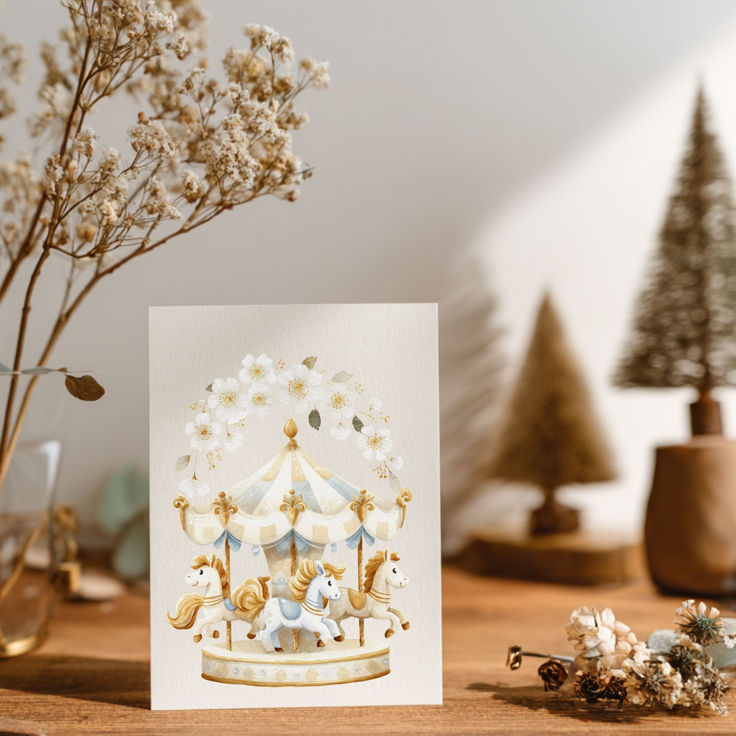 淡くやわらかな水彩で描かれた、ふんわりとやさしい空気に包まれた白いメリーゴーランド。